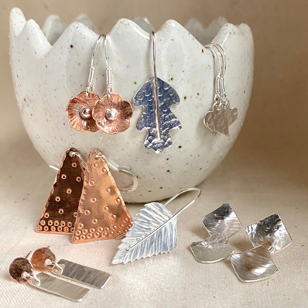 In this fun design and make workshop you will get to make up to 3 pairs of earrings with hooks and/or stud backs, and I'll bring both sterling silver and copper for you to play with. Learn how to texture, saw, shape, file, solder and polish, starting at the design process and ending up with your finished handmade earrings.