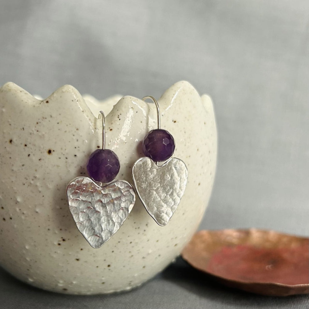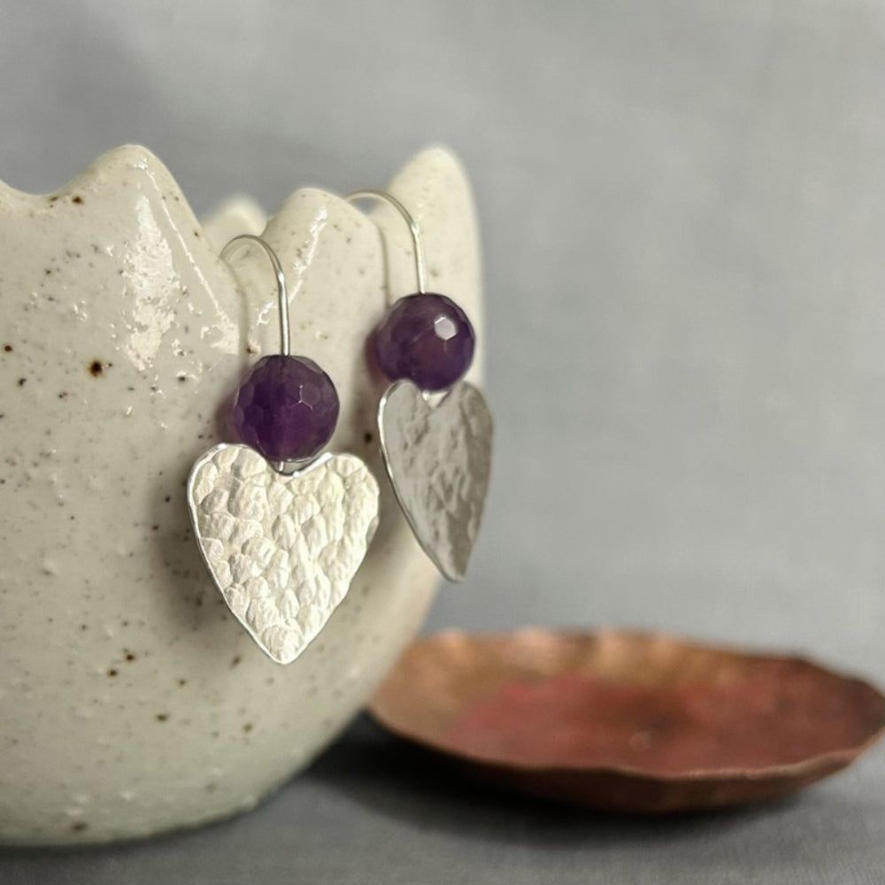 Get ready to add some stylish charm to your look with these hammered silver hearts and faceted Amethyst stone.