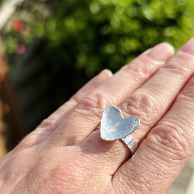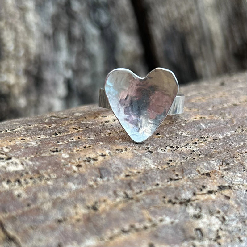 This ring is both fun and charming, the handmade silver heart sits atop a wide band, and the mix of hammer textures are added for an enchanting finish.