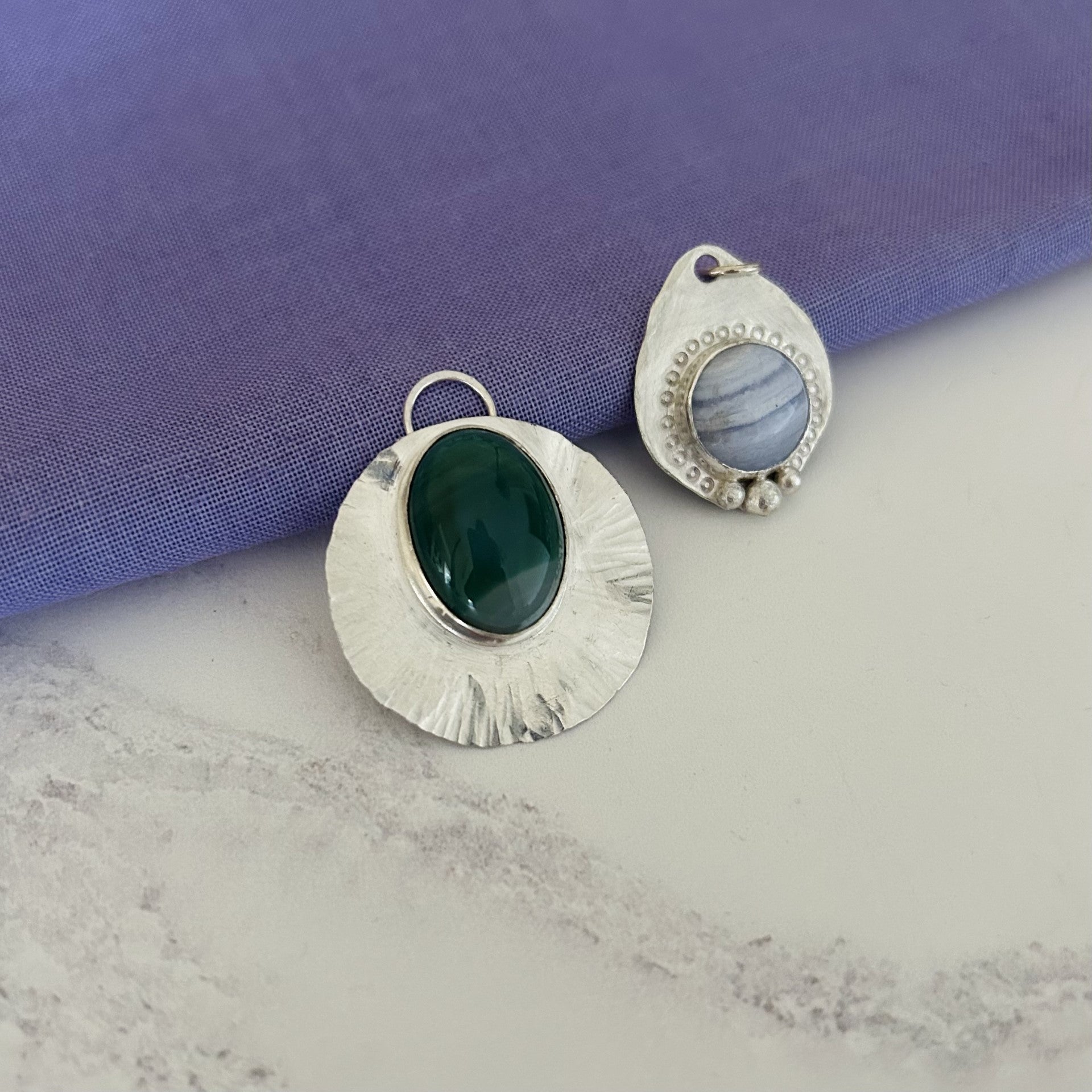 Choose from a selection of semi precious stone cabochons (about 12mm circle or 8x18mm oval) and learn how to make a bezel, solder to a backplate (3x3cm sterling silver), shape and texture your pendant, and then set your stone.