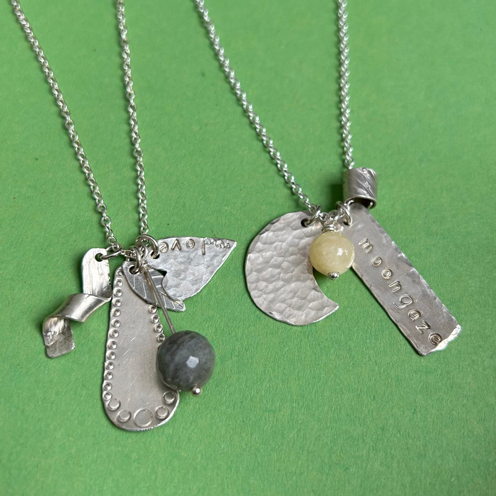 Under the tuition of Zoë you will design and make a sterling silver charm style necklace with a semi precious stone. Trying out a mixture of textures with various hammers and mark making tools, designing and laying out patterns to make the most of your silver, learning how to saw, and finishing up with a necklace for you to keep.